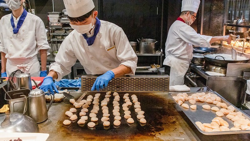 5:海鮮區旁是現煎干貝和骰子牛,這個需要拿桌上有號碼的夾子放在檯前的盤子裡,服務生之後會把煎好的料理端到桌子,消費者不用在那邊等,可以先去拿其他的東西。基本上,干貝和骰子牛我各只拿了一次,干貝一分兩顆頗大粒的,軟嫩和甜度也都可以,骰子牛因為切得夠厚口感相當不錯,帶點油質甜,灑了一點黑胡椒,還有炸蒜片可以配。