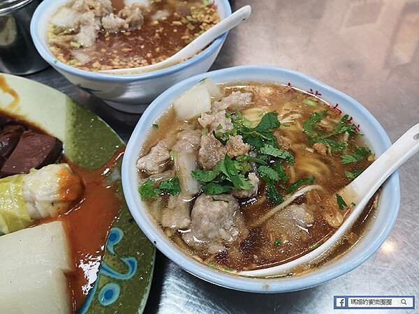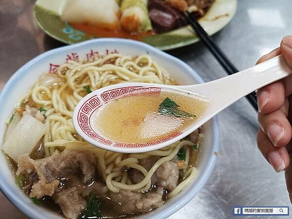 用古早的瓷碗裝著九分滿的肉焿,麵體可選擇油麵、米粉、粿仔、冬粉或泡飯,當然也可以點一碗肉焿湯搭滷肉飯也是絕配。