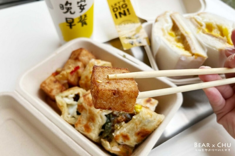 晚安早餐在現場掃碼點餐的系統裡有幾個組合套餐,這個台式肉鬆混蛋脆皮蛋餅和骰子蘿蔔糕就是其中一個套餐組合,結果骰子蘿蔔糕整個太好吃很搶戲(笑),外皮微硬的酥脆感,裡頭蘿蔔糕是純蘿蔔糕、不是加料的港式,但因為加了辣菜脯整個吃起來風味超好。