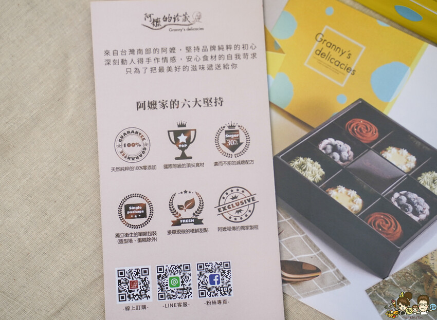天然100%零添加、國際等級的食材、香濃不甜膩的減糖配方、獨家衛生的單顆包裝、接單現做的甜點、阿嬤祖傳的獨家製程