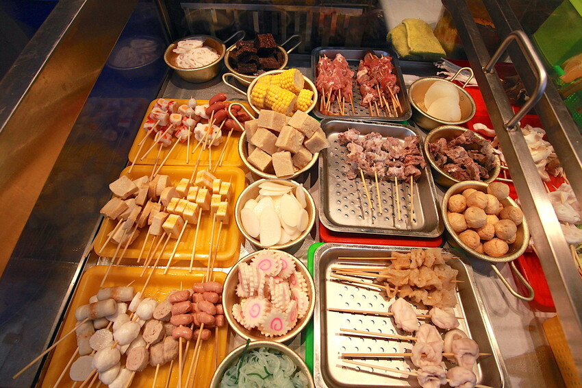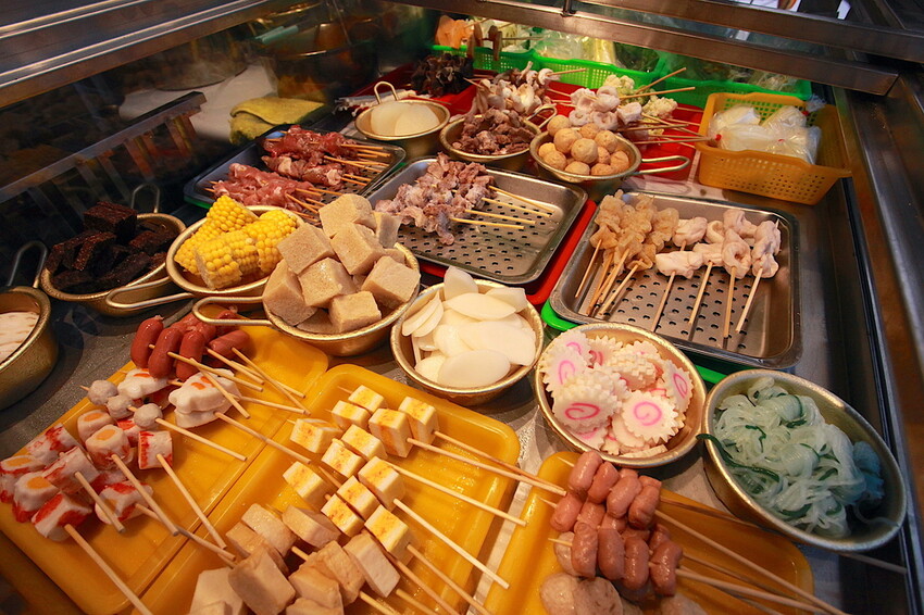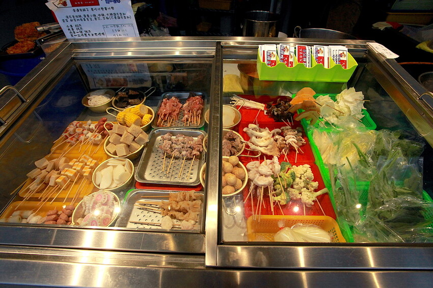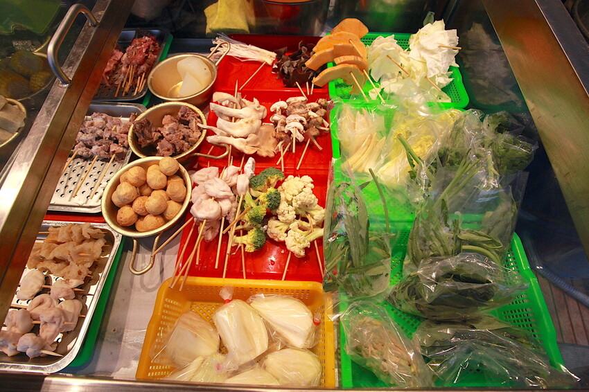 小黑綸、米血、竹節、九母卷、天婦羅、小貢丸、鱈魚丸、藕、鑫鑫丸、花耶菜、綠花椰菜、凍豆腐、豆竹、年年有魚、凱蒂貓、蒟蒻卷、年糕、百頁豆腐、長越太郎、和風堡、珍珠目魚丸、炸豬皮、老油條、豆皮、豬肉串、牛肉串、羊肉串.........等等。