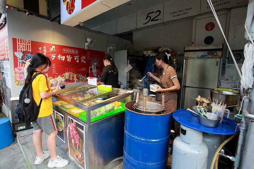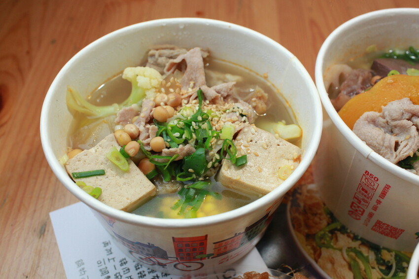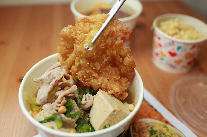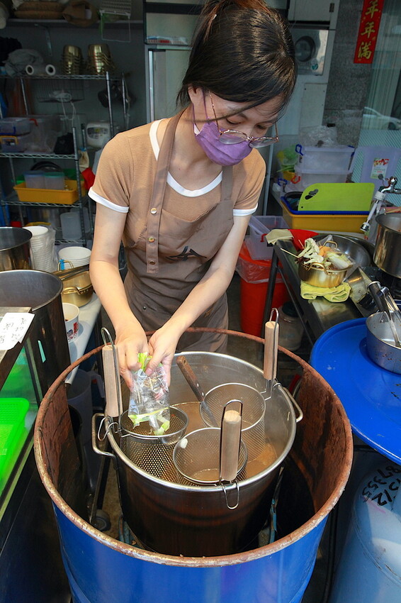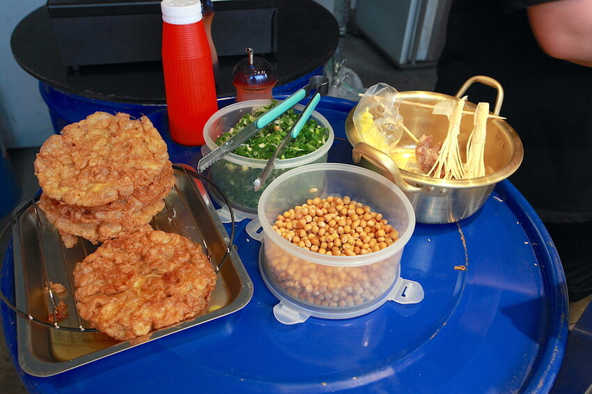 這汽油桶有擺放蛋酥、蔥花及碰豆供選擇,這碰豆可是台南古早味湯品食材,這裡每一碗冒菜街會添加碰豆。