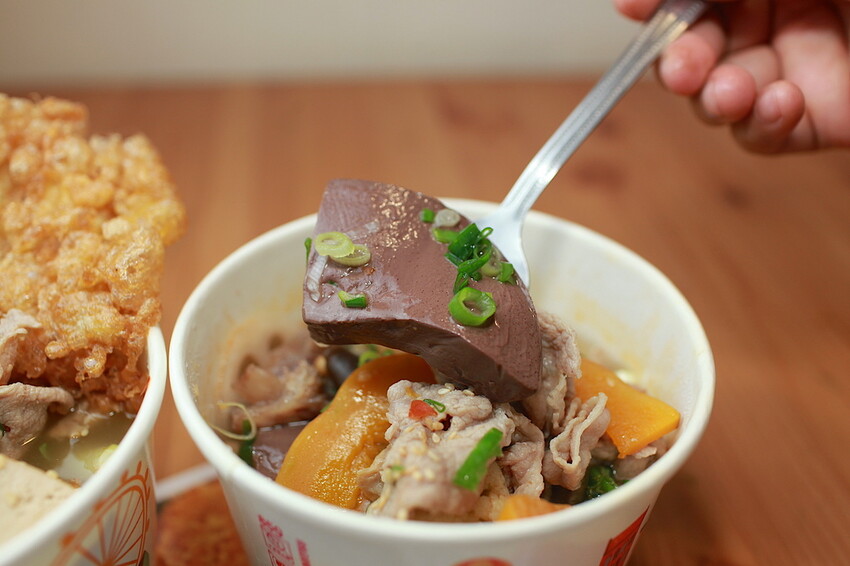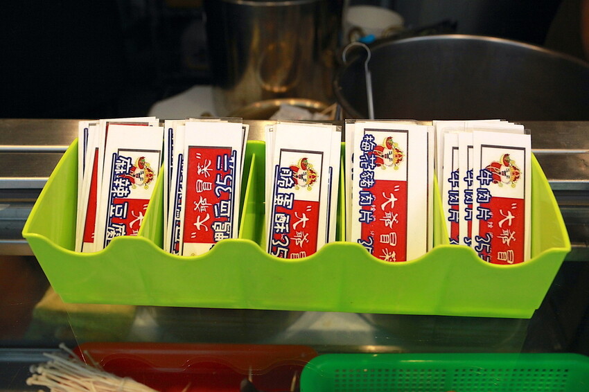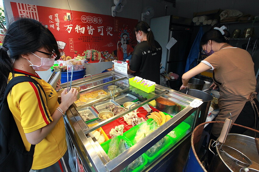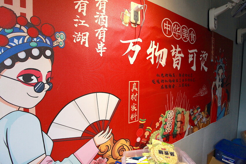檯面上有擺放招牌必點專屬菜單,麻辣鴨血、麻辣豆腐、脆蛋酥、梅花豬片及牛肉片等供拿取,交給店員來結帳和料理。