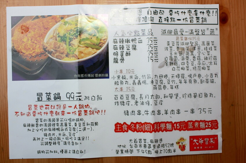 今天路過崇道路發現這家新開幕店面,還沒有到用餐時段就出現購買人潮,大紅色扛棒有「大爺冒菜麻辣燙」店名吸著我,直接看店名就知的是賣麻辣燙美食,但是看這「大爺冒菜」店名就令我覺得很納悶,好奇心驅使下就上網查詢看看,原來冒菜是四川成都特色的小吃,與四川麻辣湯有異曲同工之妙,都使用中藥材和辛香料熬煮湯底,麻辣燙是食材一串串放入湯底裡煮熟,而冒菜是把切好的食材裝入金屬篩筐,浸入湯底中高溫把食材煮熟,且冒菜比麻辣湯辣度選擇性較多,話說這裡應該知道「冒菜」是什麼吧!這家「大爺冒菜麻辣燙」是在3月初才開幕不久,小小騎樓店面僅提供外帶服務,小高發現這裡餐點每份10~35元區間,與一般麻辣燙的性價比較高,尤其中藥和蔬果熬煮湯頭特別甘甜,喜歡吃麻辣燙好友不妨換換口味,能節省荷包有可以滿足您的味蕊。