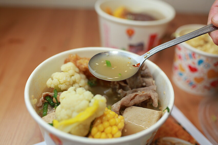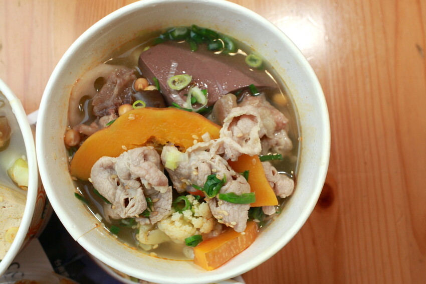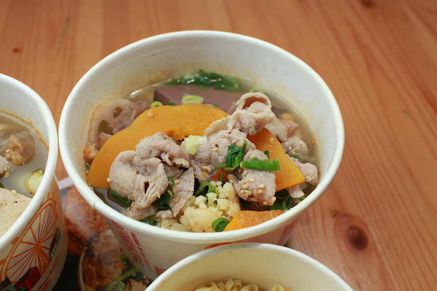 這碗冒菜裡面食材選擇很豐富,裡面有藕、花耶菜、綠花椰菜、南瓜、筋肉、豬肉....等,小高有選擇添加蔥花、碰豆及芝麻。