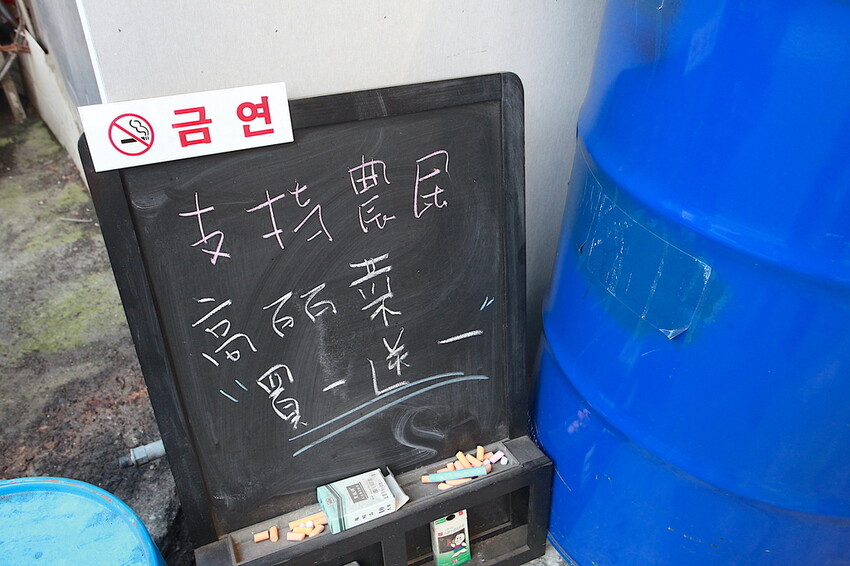 店面外頭有放置黑板支持農民,選擇高麗菜有買一送一優惠。