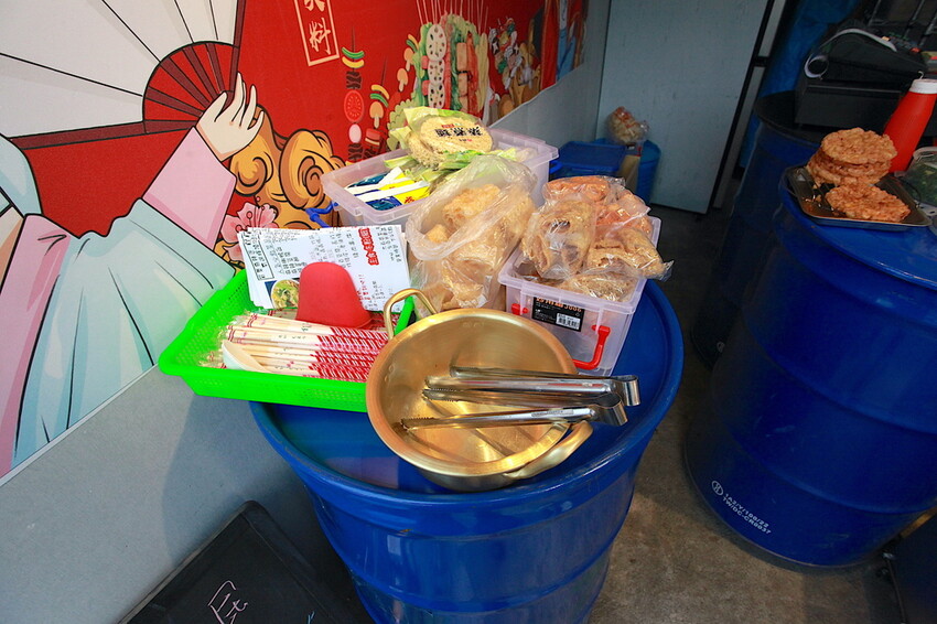 這汽油桶當作放置食材、筷子、菜單及夾子供自取。