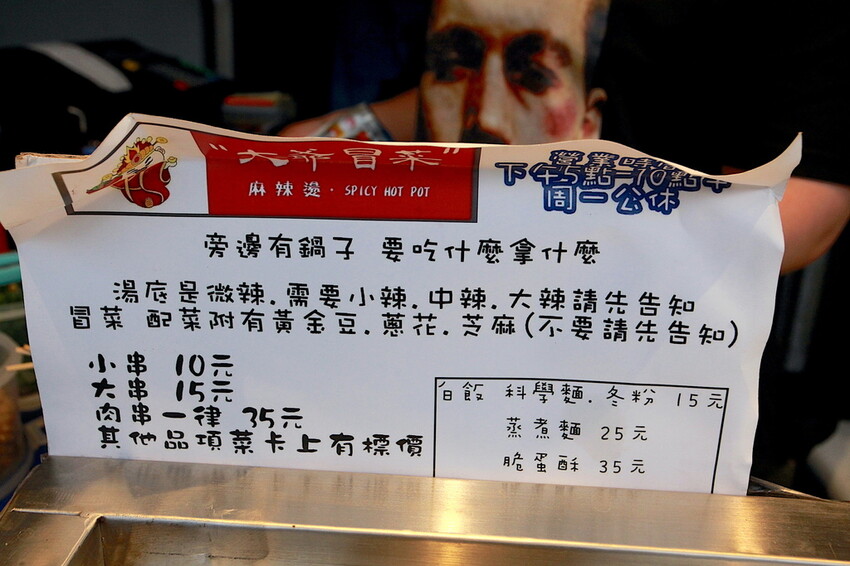 料理台有放置點餐告示供點餐參考,湯底都是微辣需要加辣請告知,這冒菜可添加碰豆、蔥花及芝麻等配料,這裡餐點定價是以大、小串來區別,至於肉類每一串定價35元。