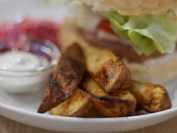 手工全麥漢堡包附上涼拌捲心菜以及薯塊。