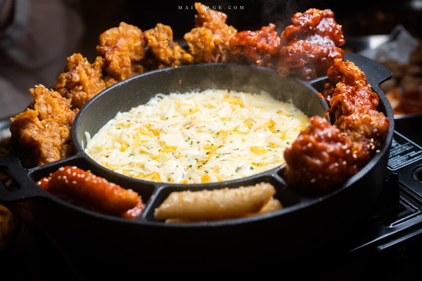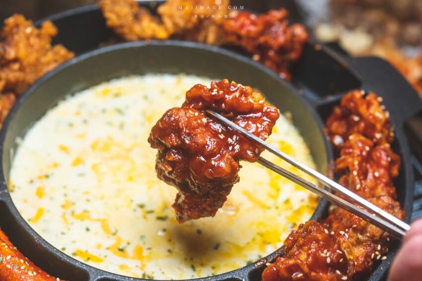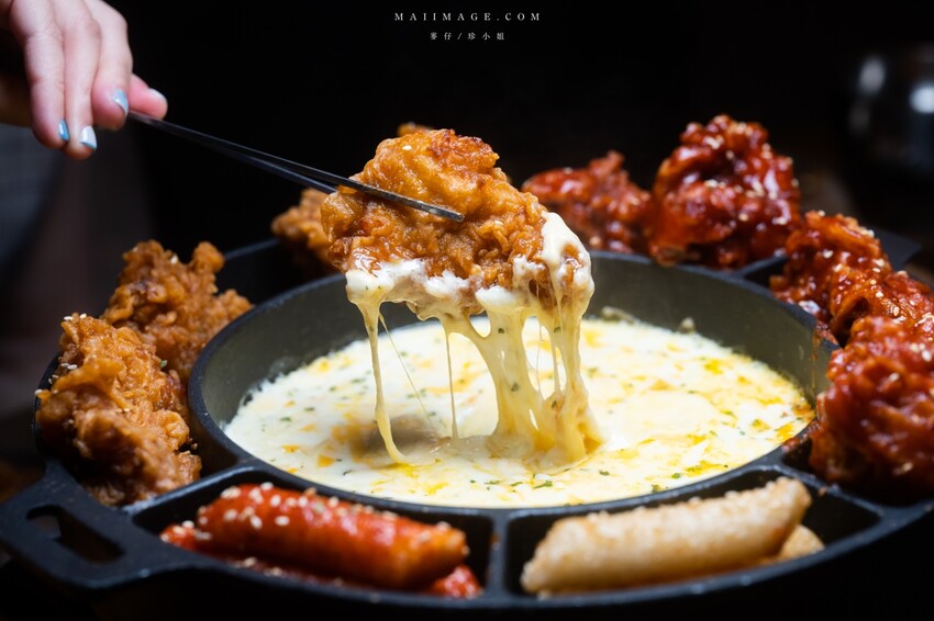再來就是把融化的起司裹在炸雞上,這畫面誰受得了啦,吃爆。炸雞外脆內嫩還很多汁,口感很不錯。