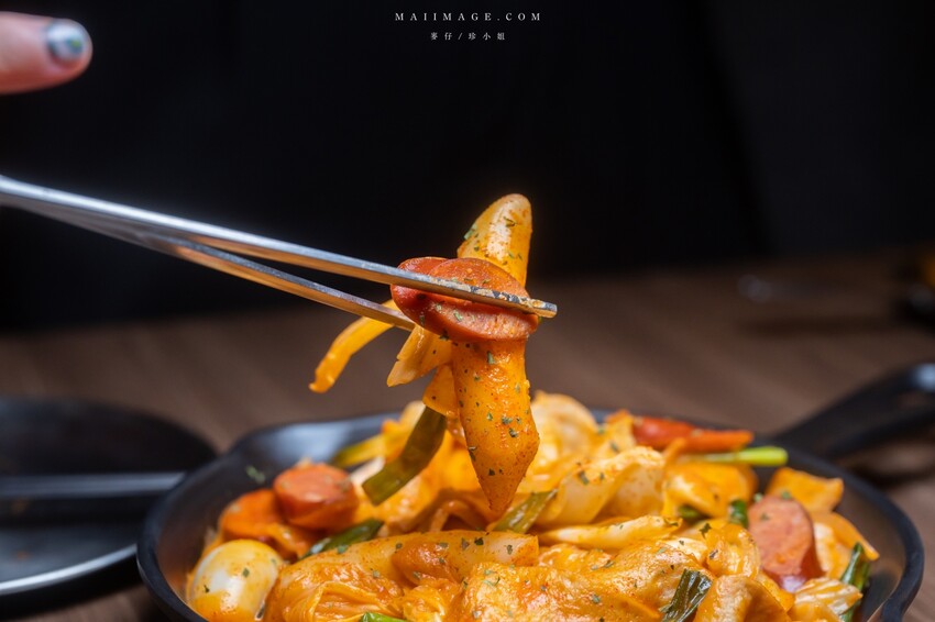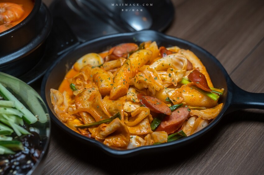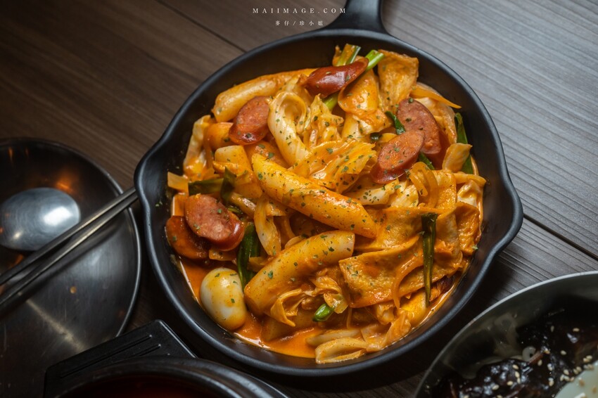 主食我們家點了粉紅醬辣炒年糕,這個年糕裡面配料不少,有香腸、高麗菜、魚板、鵪鶉蛋。