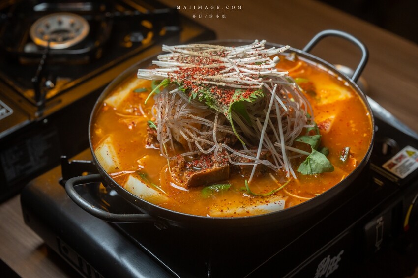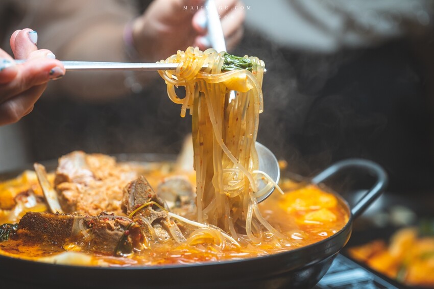這韓式粉絲可以久煮,不用擔心會煮爛,吸飽豬骨辣湯的粉絲味道很有層次,會忍不住大口吸到肚子裡。
