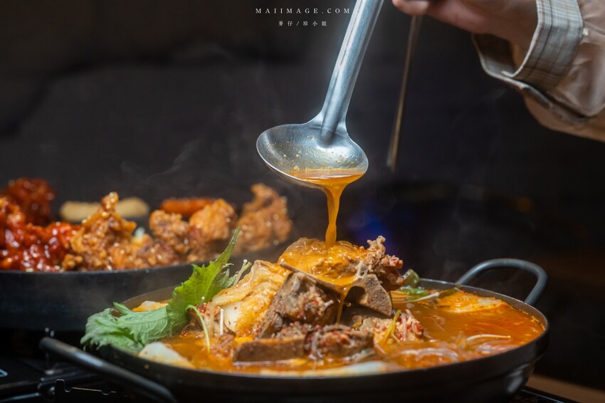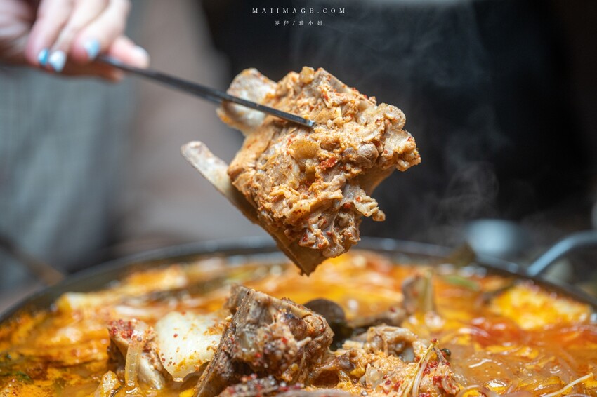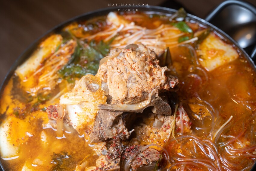 接下來這鍋也是店裡的人氣新品,馬鈴薯豬骨湯。裡面的配料很豐富,大塊的豬骨、馬鈴薯還有韓式粉絲,同樣大份量要多人一起分食比較適合。