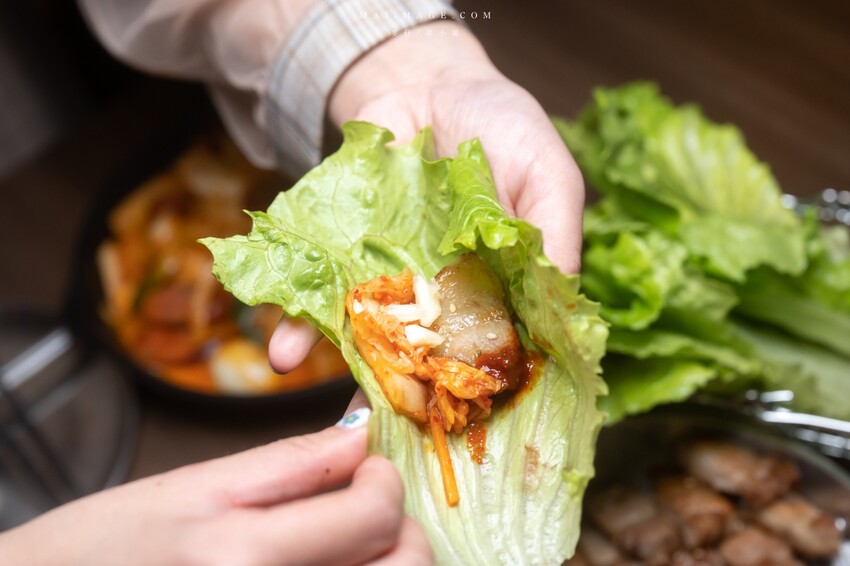 也可以用生菜葉包著豬五花、大蒜、韓式泡菜一起品嚐,解膩效果更好,口感更有層次。