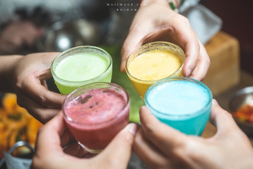 這一排是人氣必點的調酒,幾乎每一桌都有點。以韓國馬格利酒當基地的彩虹調酒,共有草莓、葡萄柚、百香果、青蘋果、藍柑橘、桑堪六種口味。