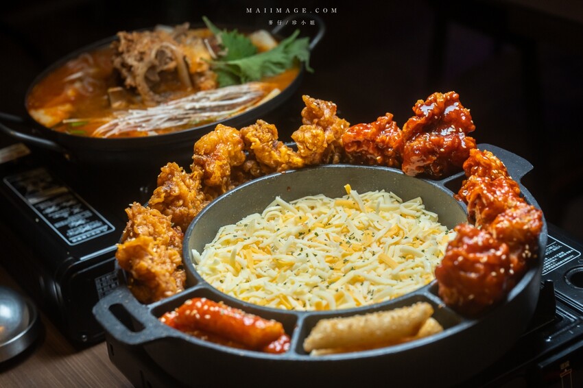 『That’s OK餐酒館』的菜單選擇不少(完整菜單),有經典必點的半半炸雞還有新推出的起司瀑布炸雞跟馬鈴薯豬骨湯人氣都很高。另外我們還加點了韓式烤豬五花跟粉紅醬辣炒年糕。