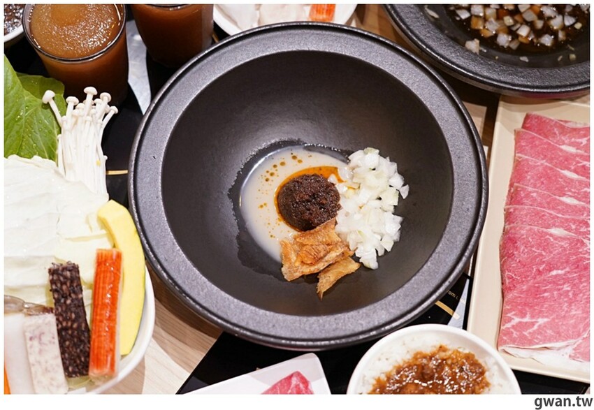 石頭鍋裡有爆炒過的洋蔥,調味裡有加點烏醋,喝起來帶點微酸口感,清爽不膩,跟沙茶鍋比起來雖然比較清淡,但口味也還不錯