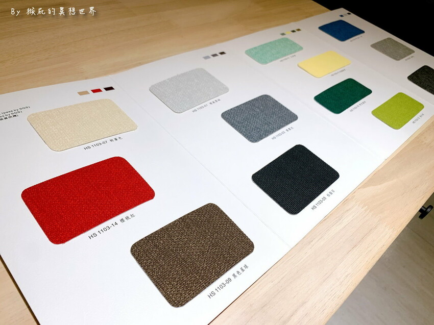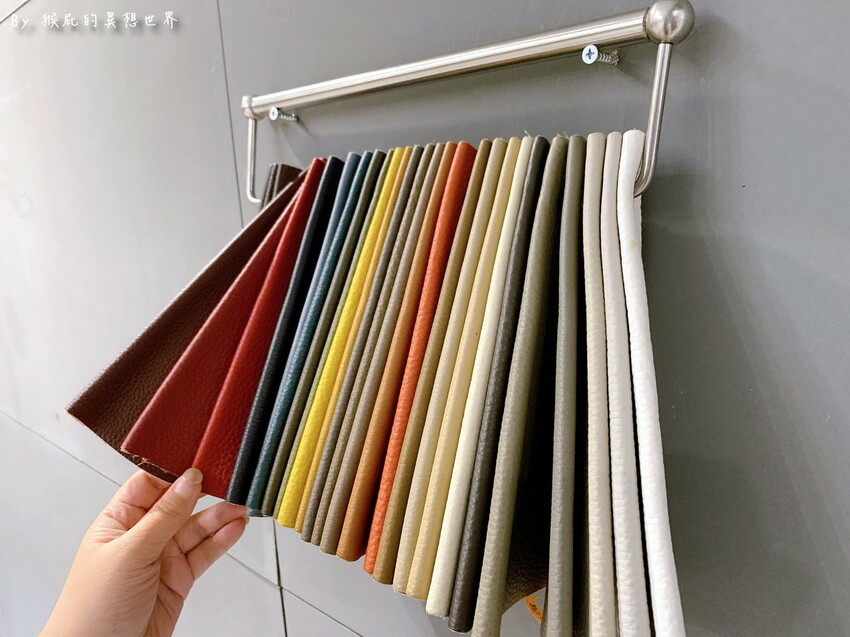 牆上有掛皮板可以參考,20幾種色系皮革很豐富,都可以量身訂做喜歡的色系尺寸。