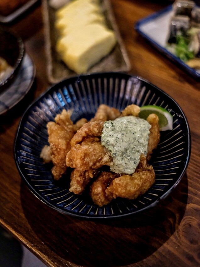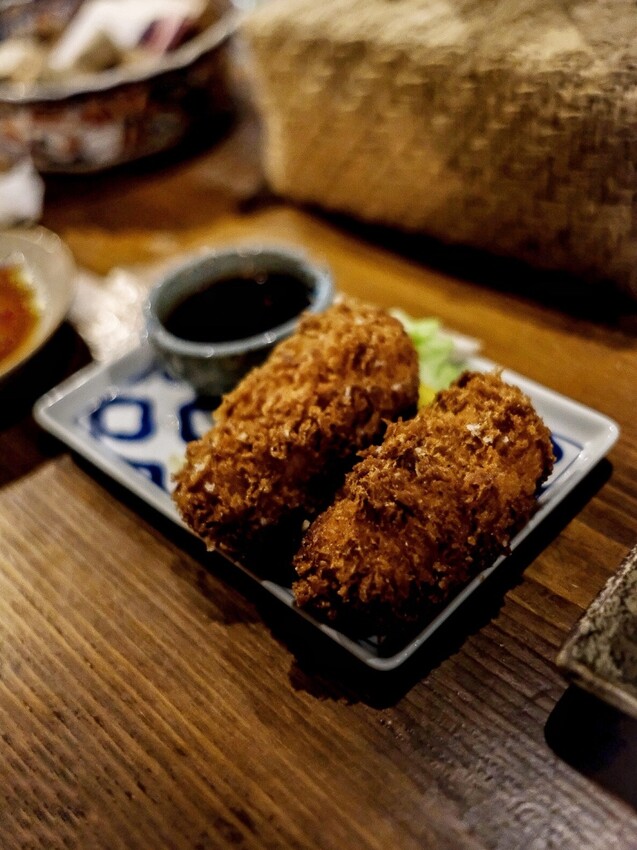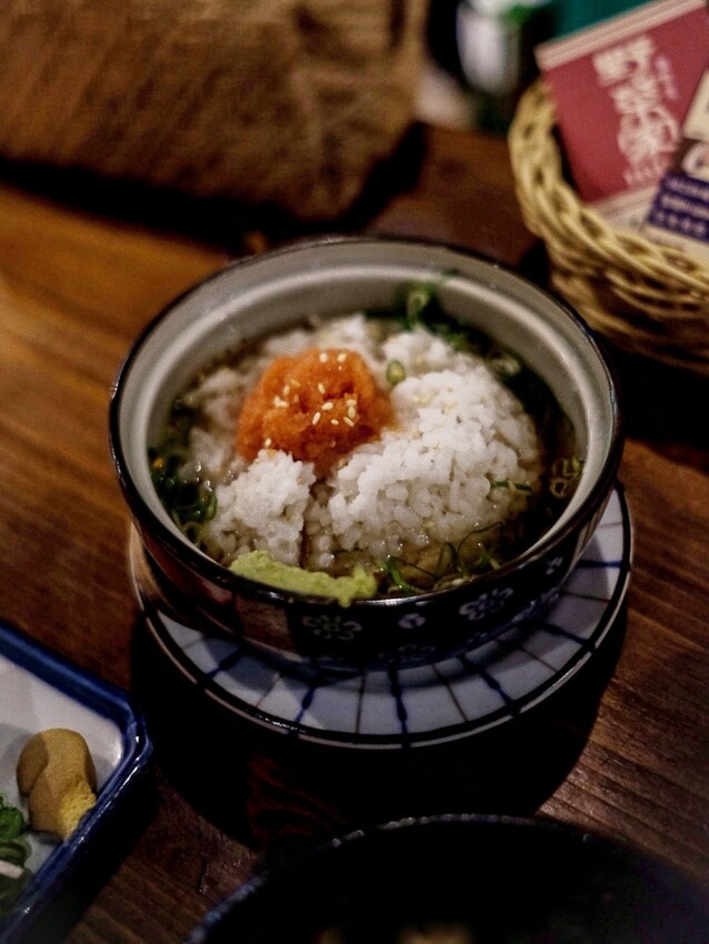 這天點的菜色大部分口味偏重,滿適合下酒,自己比較喜歡的的是炸得熱呼呼的厚片山藥南蠻、溫暖入味而且不會太鹹的牛肉味噌蘿蔔、酥脆燙口的蟹肉奶油可樂餅沾豬排醬,還有暖暖的明太子茶泡飯