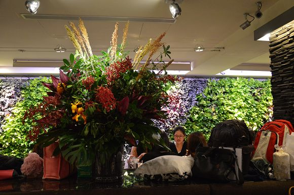 有一面綠化的牆面似乎要營造悠閒的環境,不過店裡充斥著喧鬧聲,實在悠閒不起來。