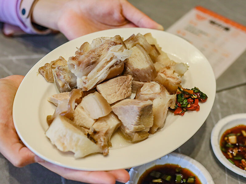 這盤白切豬腳才$100!這也太佛心了,特選肥瘦比(4:6)黃金的黃金比例部位,切成小塊方便品嘗;白肉豬腳一定要沾老闆特製的生辣椒蔥醬油,辣香有勁,想吃嫩筋、腿肉自己夾,口感軟Q不油膩,一定要試試看~