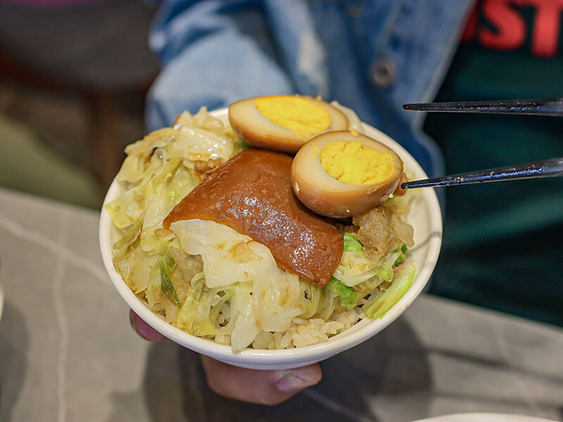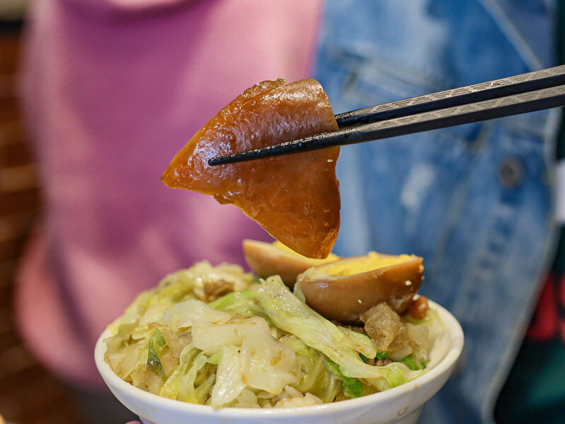 把肚子留點吃豬腳,高麗菜飯就是好選擇,把高麗菜炒的清脆蓋滿白飯淋上鮮甜美的高麗菜湯汁,再蓋上一塊油亮亮的豬皮~好吃的美味就是簡單;屬於中南部的傳統滋味;別忘了也可以加上一匙豆豉豬油渣。
