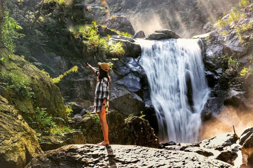 仙氣十足的銀河洞瀑布,近年來名氣完全不輸烏來瀑布,瀑布旁有呂洞賓廟依山勢蓋在岩洞裡,更增添瀑布的神秘感。越嶺登山步道全長2457公尺,步行時間150分鐘,終點為貓空纜車站,若從登山口走到銀河洞瀑布則約30公鐘,雖然不遠但全程為階梯,相當考驗行者體力。
