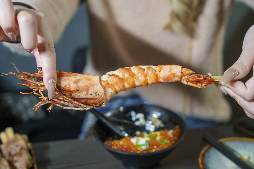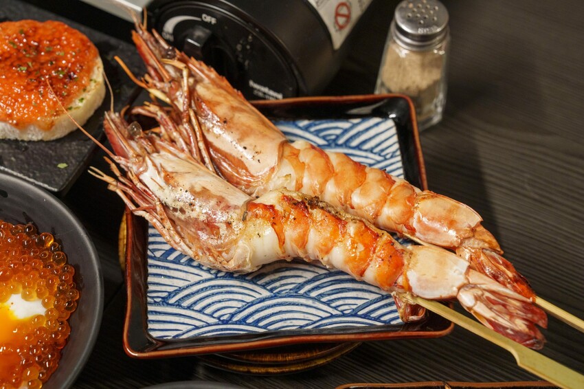 還有特大花蝦串也很必點,經過炭烤好香氣十足,蝦子的肉質非常扎實鮮甜,一份有兩串可以和朋友一起分享!