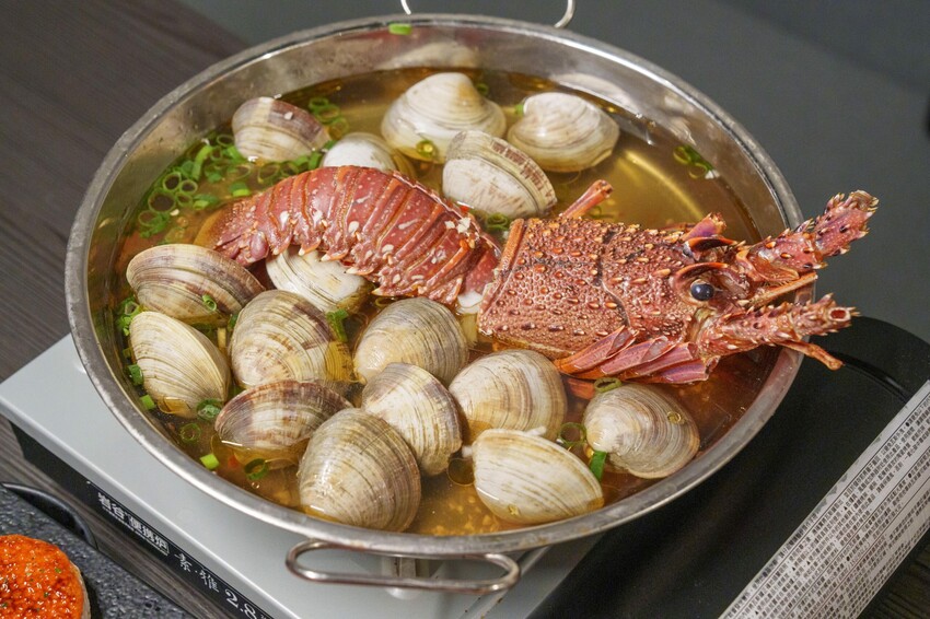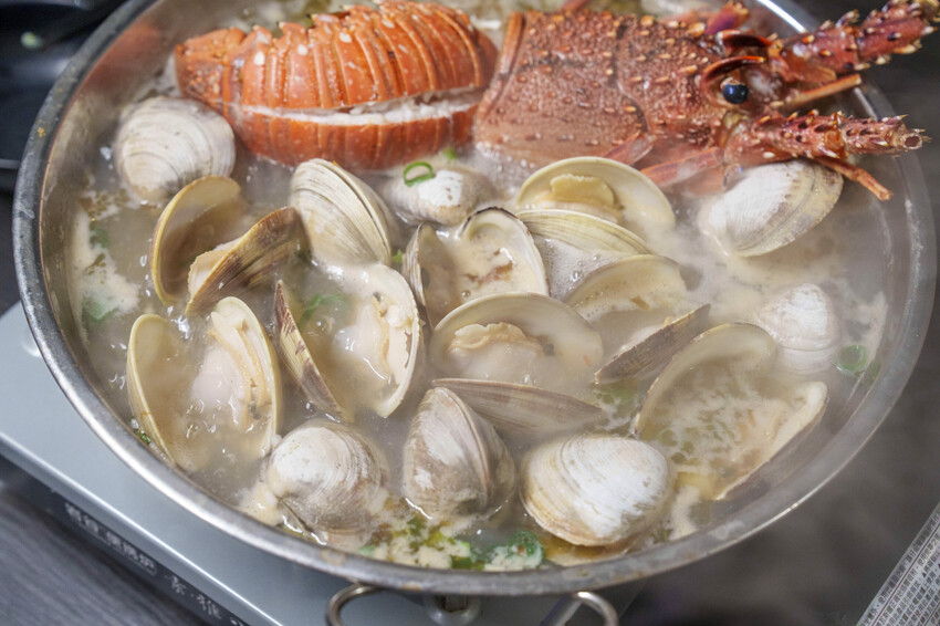 「水姑娘龍蝦牛奶貝鍋」光看就讓人口水直流,新鮮牛奶貝直接擺滿整鍋,搭配上超新鮮的水姑娘龍蝦就算痛風也願意啊~~