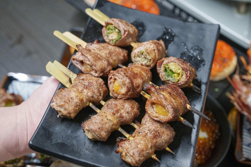 串燒的部分很推薦「綠寶石肉串」,牛肉裡分別是包橘子、龍鳳果和綠葡萄,鹹鹹甜甜的口感非常好吃特別,一定要品嚐看看!