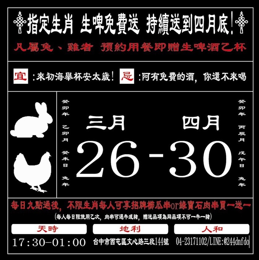 3/26-4/30 宵夜場21:00過後,不限生肖,每人可享 招牌櫛瓜串 或綠寶石肉串 買一送一