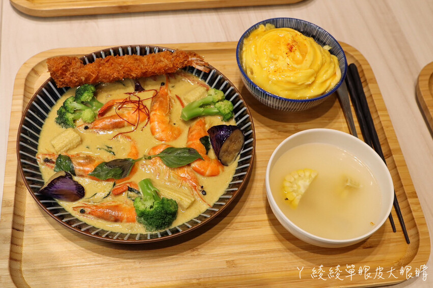 推薦加點炸蝦跟螺旋蛋會更滿足喔!綠咖哩有點辣呢!但是非常的下飯,是我的愛!咖哩飯都有附湯品及小菜,湯品跟咖哩醬可以免費續加一次!