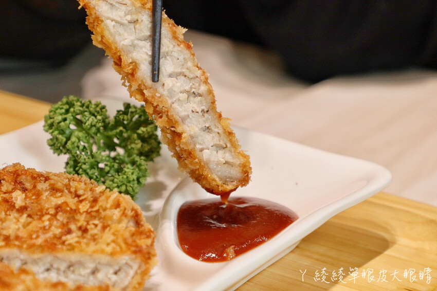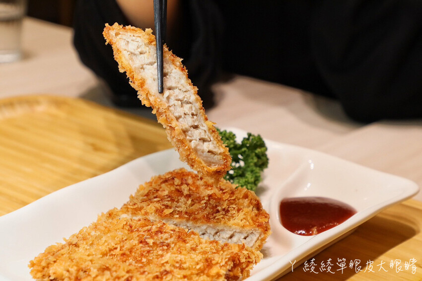 喔這名字取的不錯,果然是大大的豬排,從側面看就知道有多厚實,邊吃邊發出咔滋咔滋的聲響!