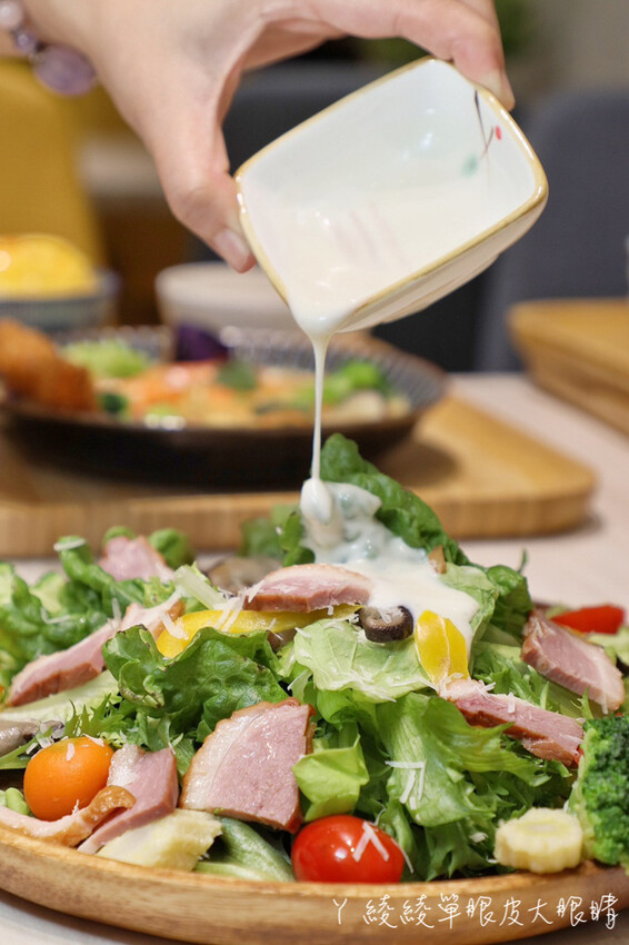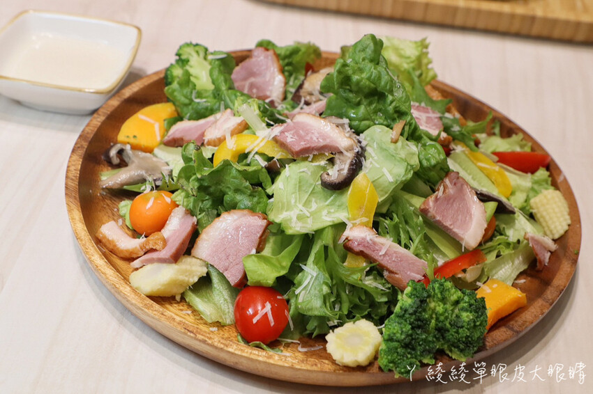 喔我的天啊!沙拉份量超級澎湃,每片燻鴨胸的厚度都很剛好,鹹香的風味搭配清爽的優格醬,這個真的要點欸!