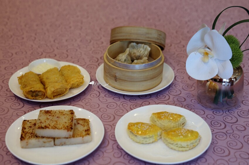 腐皮蝦捲、蘿蔔糕、魚子燒賣、珍珠丸子、三絲素春捲、魚翅餃、韭菜煎餅、叉燒酥、蔥燒酥餅。
