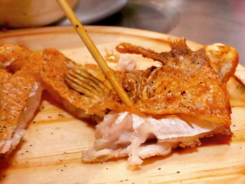 經過高溫油炸的魚下巴. 肉質鮮甜/口感酥脆.配上冰冰涼涼的啤酒. 在週末夜晚吃是最棒的享受