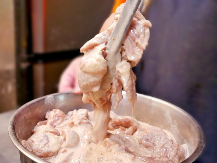 特別選用的大塊的無骨雞腿肉.事先放入秘製醬汁醃製4.5小時.再裹上特製粉漿.來鎖住雞腿肉水分.現場光是看了就讓人口水直流!