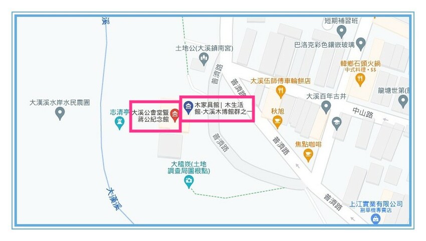從地圖上不難看出大溪公會堂(蔣公紀念館)就緊鄰著木家具館和木生活館