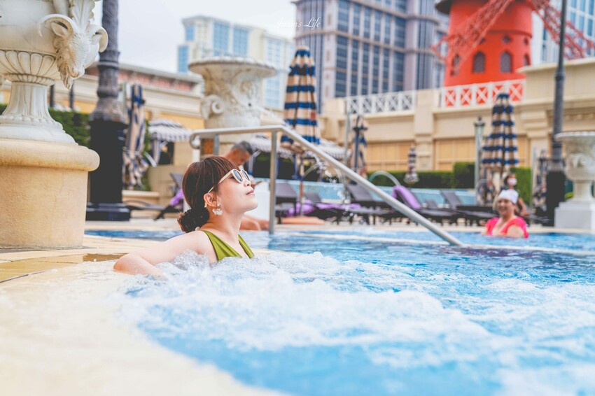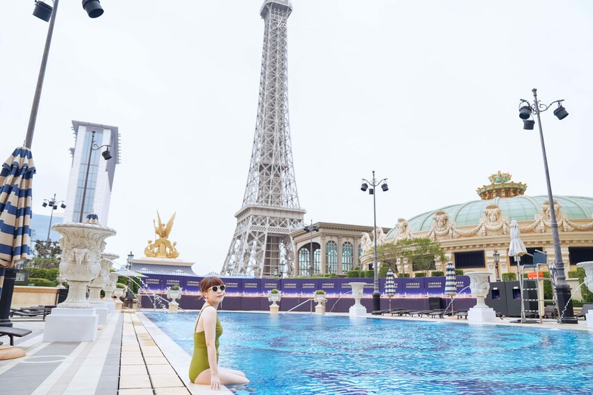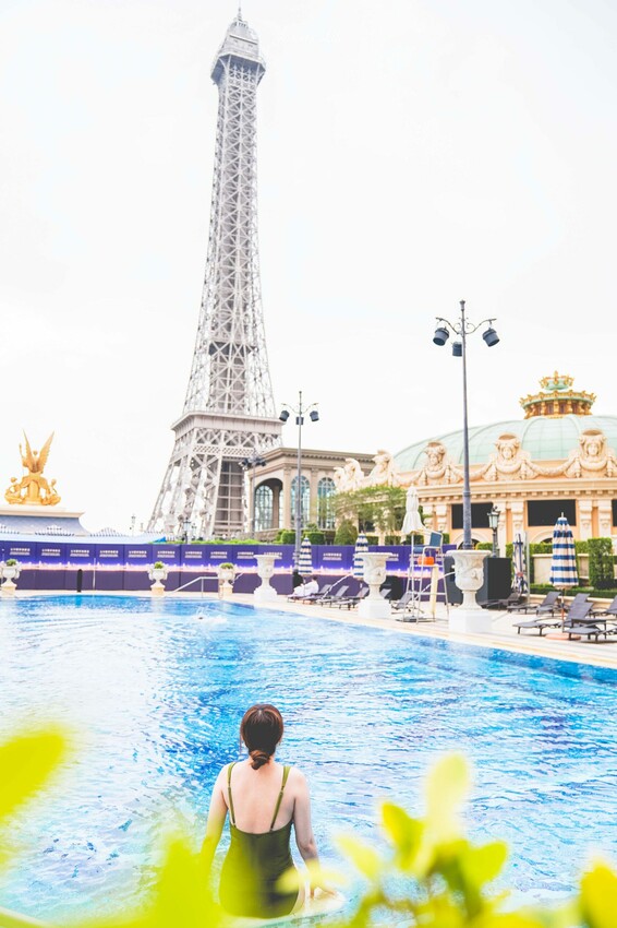 澳門巴黎人酒店泳池位於酒店6樓,女孩兒們不要錯過泳池與巴黎鐵塔合影的機會了