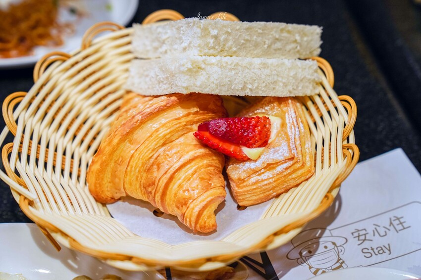 牛角可頌、丹麥糕點、原味吐司配牛油及果醬