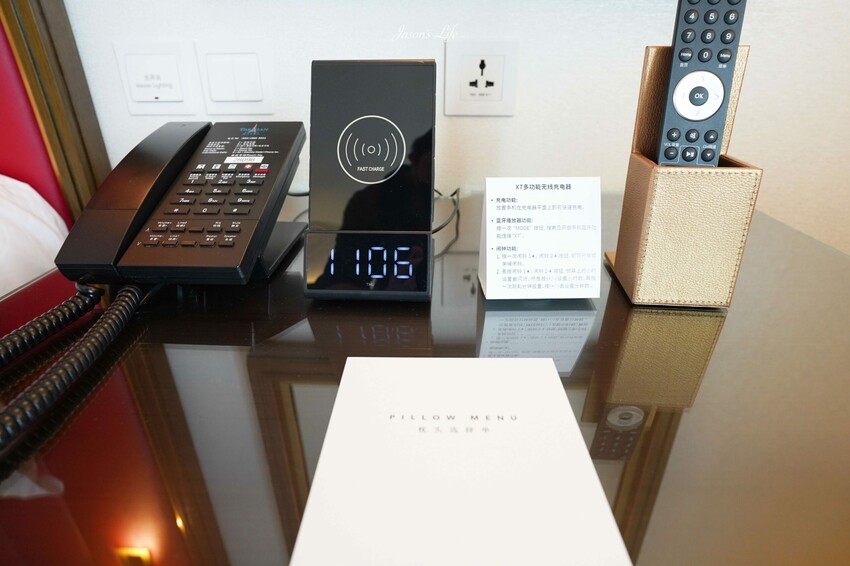 床旁桌上貼心準備多功能無線充電盤,只要把手機放在上面就可以自動充電囉