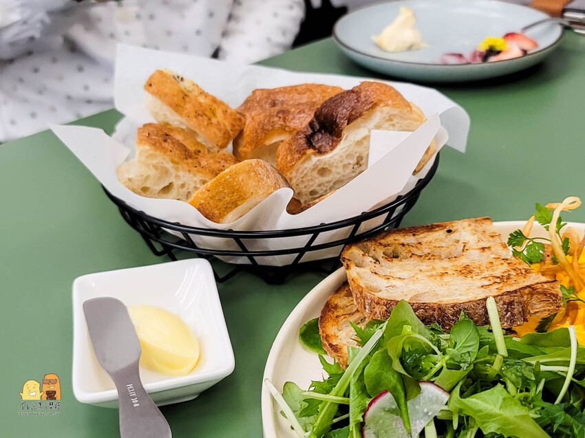 三種麵包組合的綜合麵包籃,約6片的麵包,幾乎就是淺嘗~但是麵包吃得出用料很實在,麵粉跟奶油都是很足的香氣,口感也是外酥內軟,尤其那個咬勁很不錯