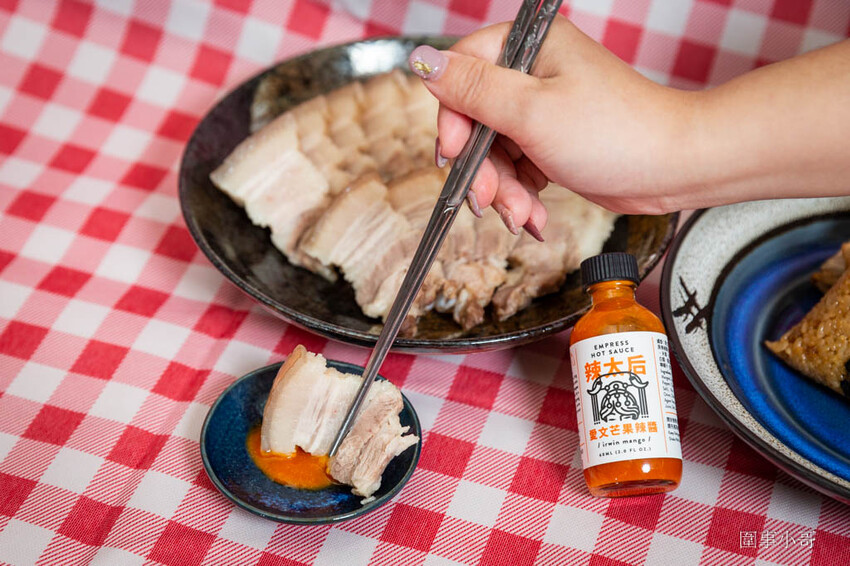然後像水煮的五花肉一般刻板印象中大多都是做成蒜泥白肉之類的料理口味,但是單純的五花肉配上不同口味的辣太后辣醬,都能讓五花肉的肉香更上一層樓!比如這個愛文芒果辣醬,溫和的芒果酸香讓五花肉吃起來很清爽,有解膩的效果呢!