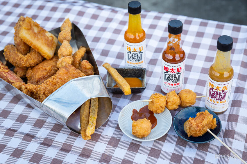 特別請老闆先別灑上胡椒粉,咱們來單純地試試炸物們跟辣太后的各式辣醬的契合度吧~然後把隔壁麵包店的弟弟跟快炒店的阿果還有炸雞店的夫妻兩人都一起找來試試,加上我剛好五個人嘛~然後發現了一件很奇妙的事情,投票的結果竟然是五種口味的辣太后辣醬各得一票!只能說辣太后的各種口味辣醬都非常的好吃啦!