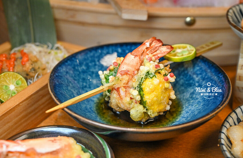 外表相當繽紛的炸蝦球,裡面還用紫蘇葉包裹著一顆蛋,咬下去的時候讓人相當驚艷,豐富口感的變化讓蝦球變得有趣又好吃!