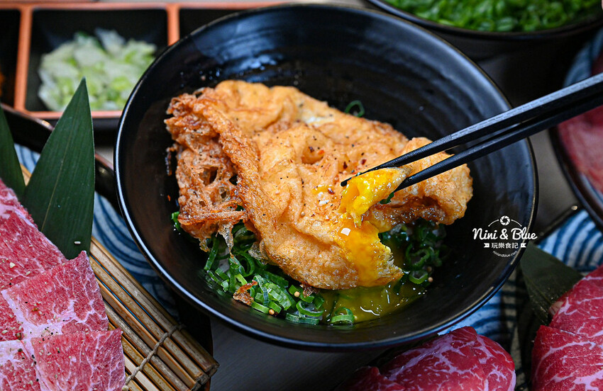 套餐價格滿400元就可免費升級,香Q越光米飯淋上鹹甜醬汁再鋪滿鮮綠的蔥花,中間打上一顆生蛋黃,色彩繽紛讓人很有食慾!