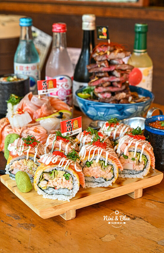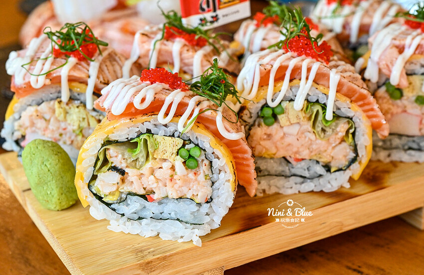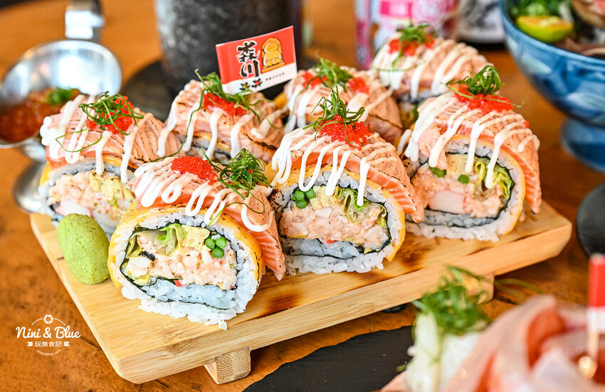 這款華麗的花卷壽司一直是森川丼丼的招牌餐點,裏面包捲著龍蝦沙拉、玉子燒、蘆筍、生菜,上面覆蓋一片超厚的鮭魚生魚片、起司片微炙燒增添香氣,再擠上甜甜美乃滋、橘紅色蝦卵與青蔥絲點綴,不只好看、好拍也好好吃!!