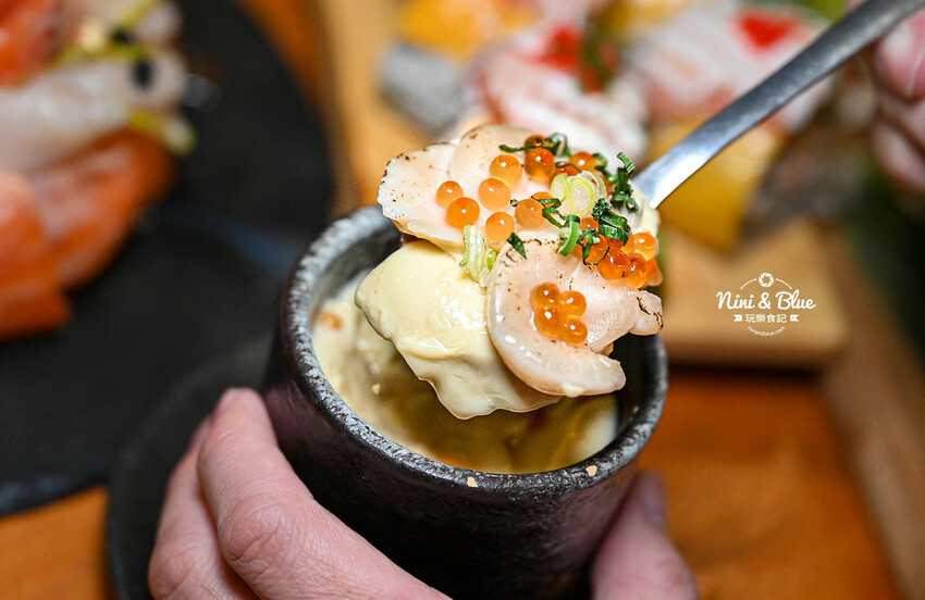 適量的鮭魚卵在口中彈跳加上和微炙燒過的生食級干貝Q嫩鮮甜,口感更加豐富多變