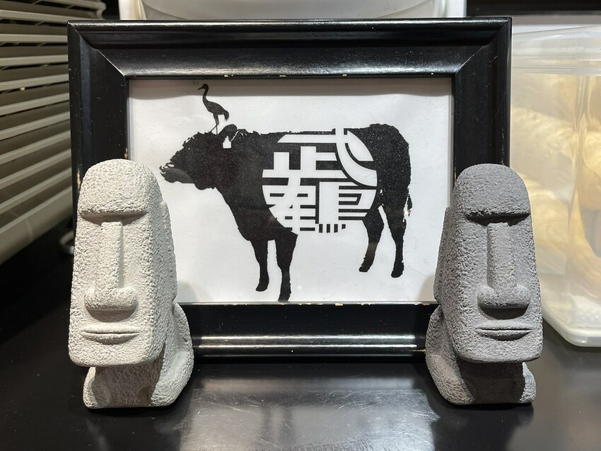 日式風格的扛棒,簡潔純白的招牌,墨黑的書法體【武鶴和牛火鍋】,加上和牛的圖案,