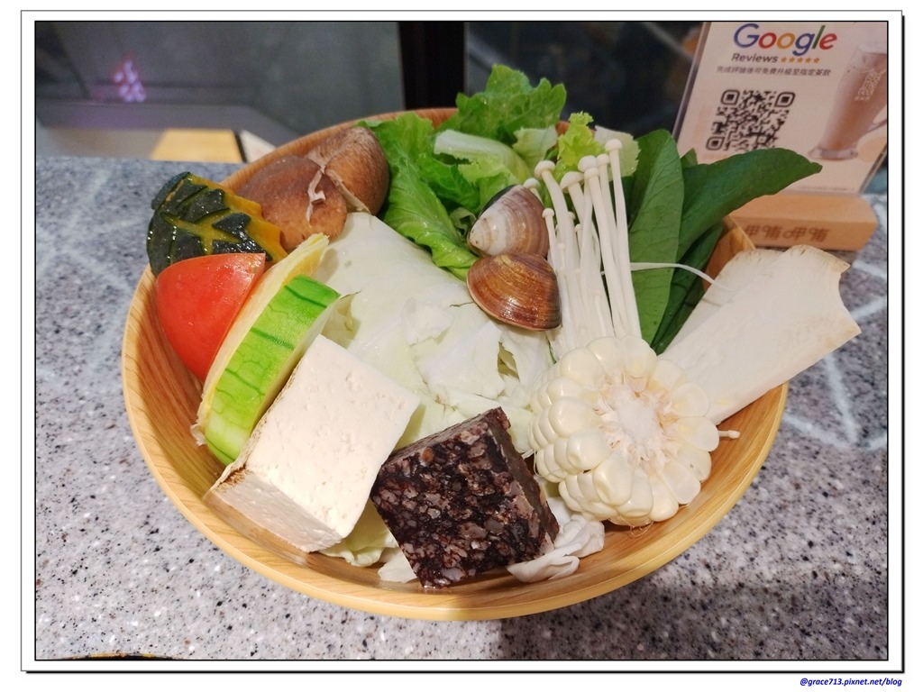 菜盤, 蔬菜為主, 還有蛤蠣, 及一個蛋餃及豬血糕,